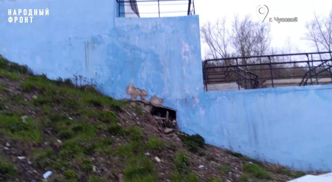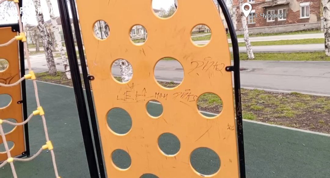 Хуже всего ситуация в Чусовом. В 2020 году там реализовали проект благоустройства улицы Ленина "Чусовские атланты" за 75 миллионов федеральных рублей. Были созданы четыре активные "станции". И вот уже посыпалась прежде яркая резиденция ДКЖ: на ограждении и фасаде здания зияют серые проплешины, а фрагменты штукатурки лежат на земле. Возле Дворца металлургов видны трещины в асфальте, сквозь расколовшуюся плитку проросла трава, разваливаются вазоны, вокруг шахматной доски облезает покрытие. На детской площадке дыры в резиновом покрытии, торчат металлические элементы, конструкции изрисованы граффити.